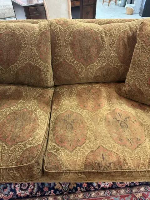 Upholstery features a carefully arranged medallion design in warm tones that coordinate beautifully with brass accents, dark woods, or neutral walls. The result is a versatile centerpiece that elevates a traditional parlor or a contemporary open-plan living space.