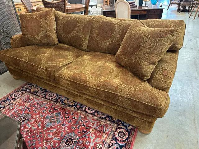 Make a statement with this spacious sofa that blends a rich gold, red, and brown medallion motif with cloud-soft down cushions. Designed for rooms that welcome conversation, entertaining, and everyday lounging, this piece brings classic patterning into a modern living area.
