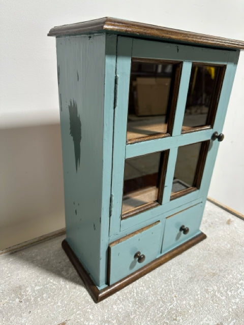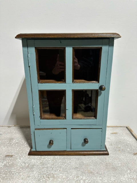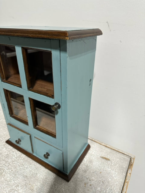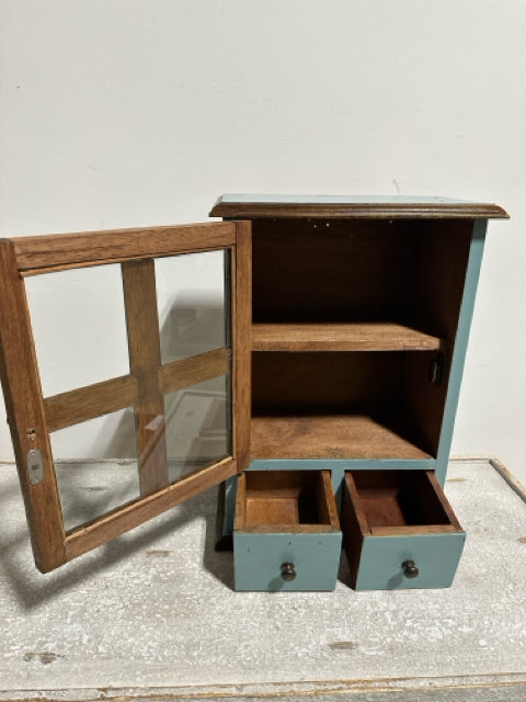 Small Blue Wooden Cabinet With Glass Door And 2 Drawers