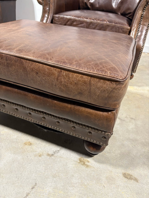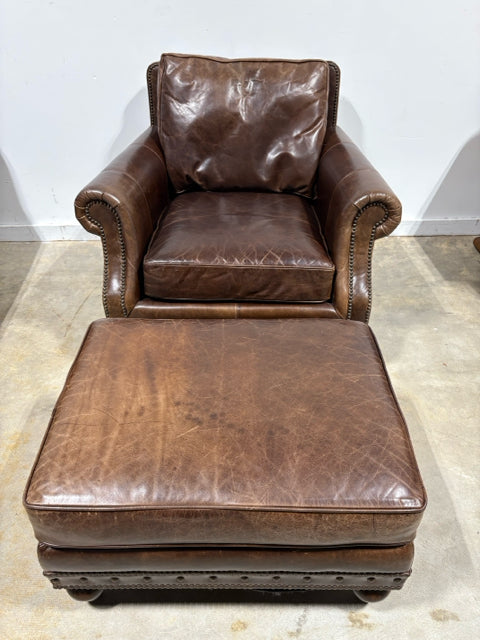 Bernhardt Dark Brown Leather Chair With Nailheads And Ottoman