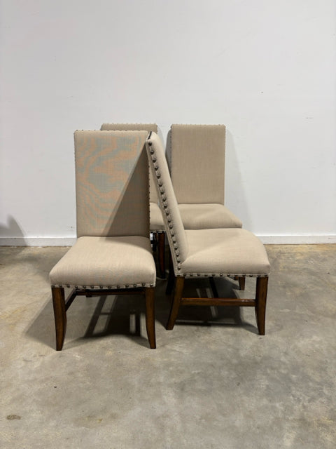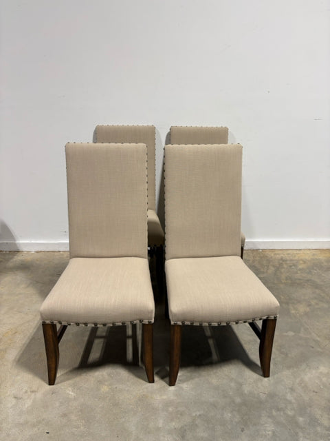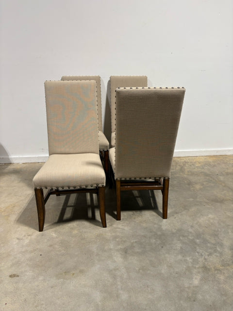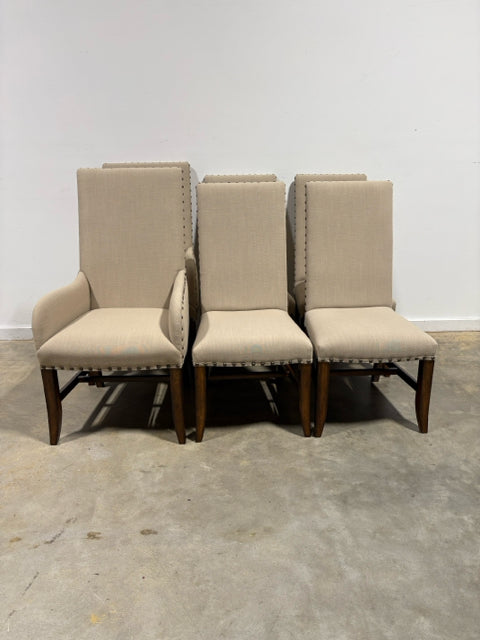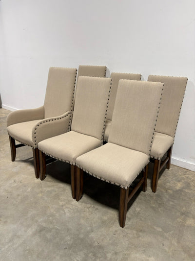 Set of 6 Tan Dining Room Chairs With Wood Legs And Nailhead Trim
