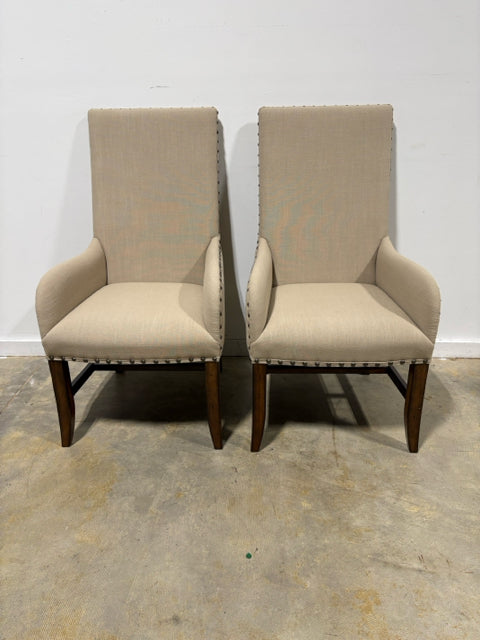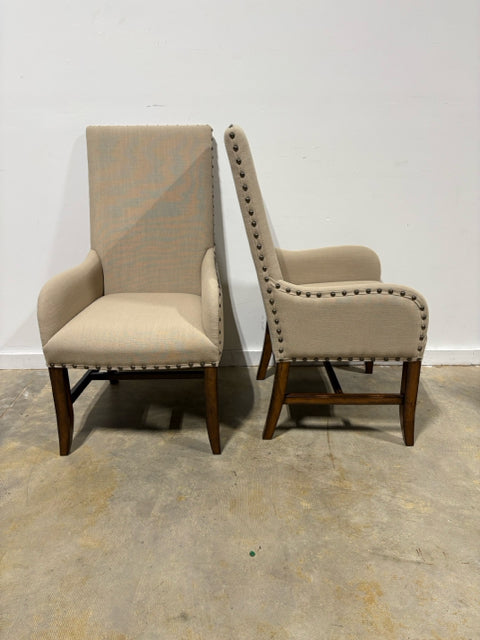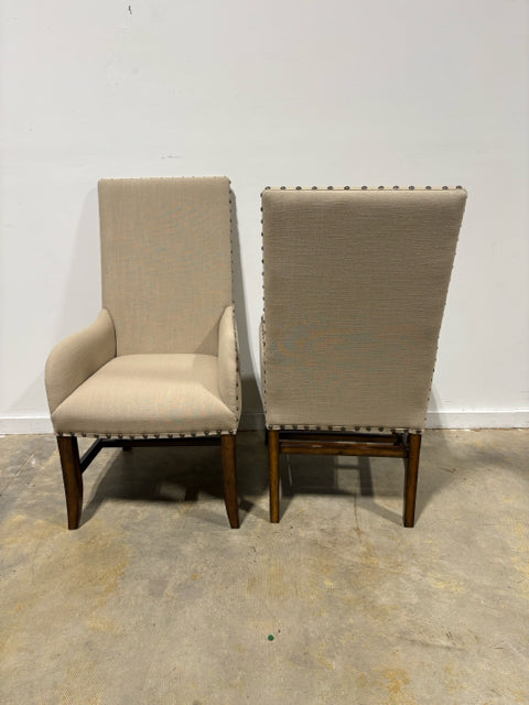 Set of 6 Tan Dining Room Chairs With Wood Legs And Nailhead Trim. 4 Armless and 2 With Arms.