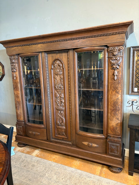 Antique Dark Wood Carved Cabinet With Three Doors And Glass Front