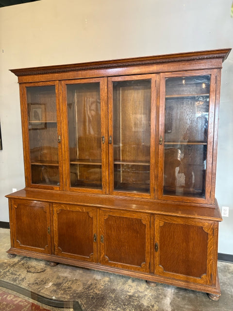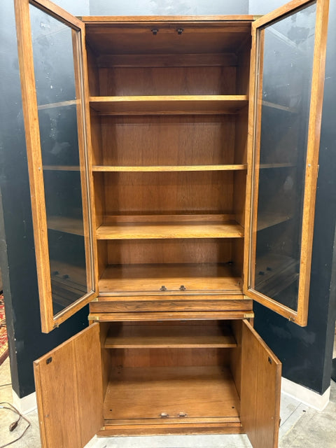 Two Piece Glass Front And Burled Lighted Wood Cabinet With 4 Doors And 4 Shelves
