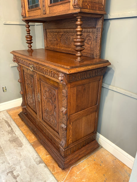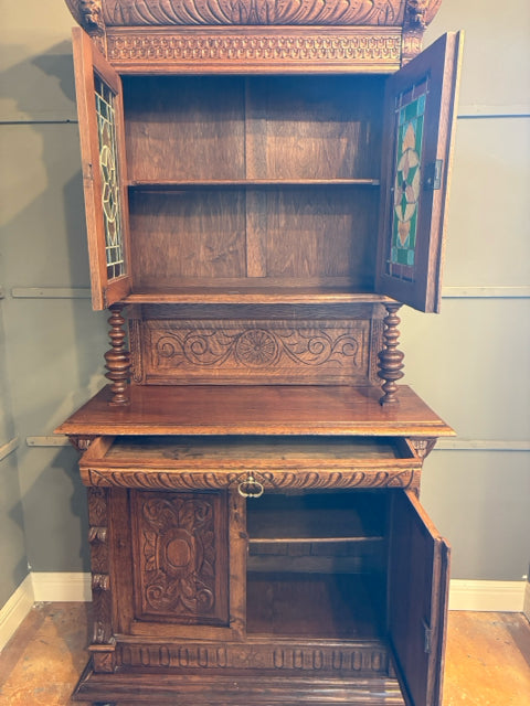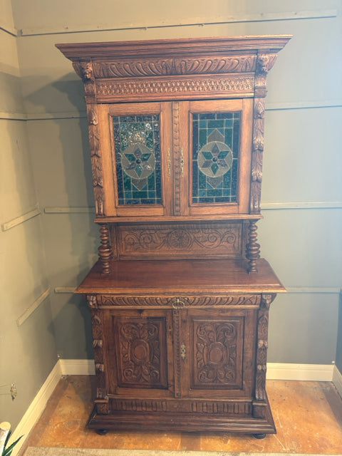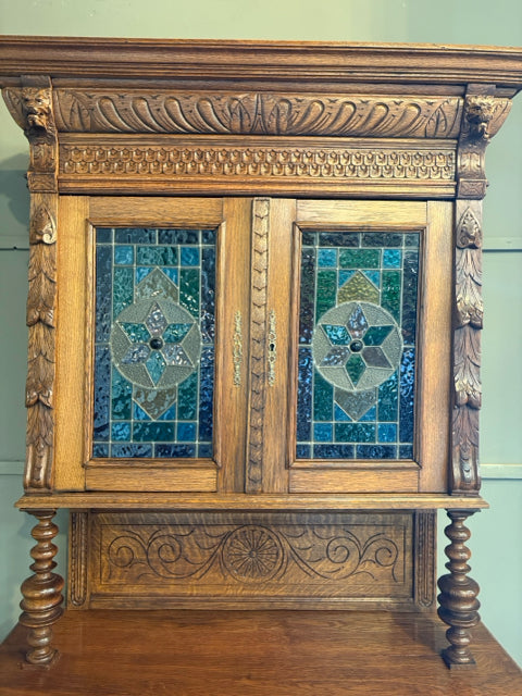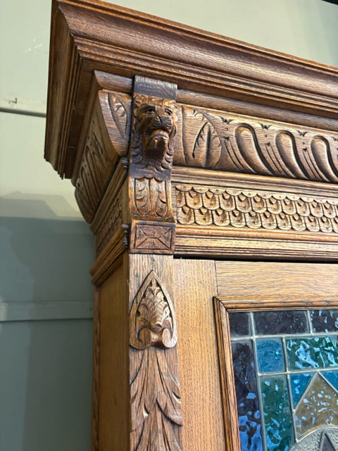 Gothic Style Antique Wooden Cabinet with Stained Glass Doors
